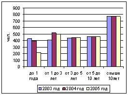 Как видно из табл. 1 и рис. 4, наибольшее количество работников имеет стаж свыше 10 лет, следует также отметить, что численность этого персонала за 2003-2005 гг не менялась. Наименьшее количество работников имеют стаж менее 1 года.
