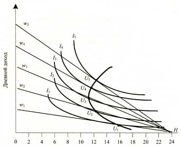 Величина w соответствует наклону бюджетной линии. Если почасовая ставка оплаты труда растет, то бюджетная линия становится круче. Человек, осуществляющий выбор между доходом и досугом, максимизирует полезность путем приведения в соответствие предпочтений, иллюстрируемых кривыми безразличия, с теми объективными рыночными возможностями, которые отражены бюджетной линией.