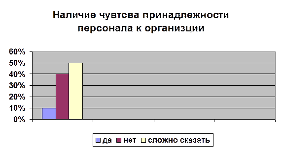 Персонал не уверен, что имеет чувство принадлежности к предприятию, 40 % опрошенных думает, что чувство принадлежности отсутствует (6.).