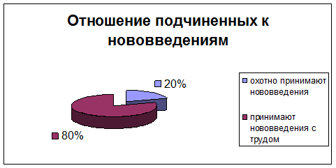 При введении инновационных решений руководители сестринских служб сталкиваются с определенными сложностями со стороны своих подчиненных и вышестоящего начальства. Лишь в 20% случаев подчиненные сотрудники охотно принимают нововведения. В 80% случаев принимают с трудом, мотивируя тем, что старые методы работы привычнее и нет желания что-то менять в своей работе.