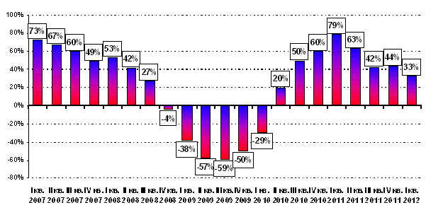 Темпы прироста объемов продаж новых иномарок в РФ по отношению к соответствующему периоду предыдущего года