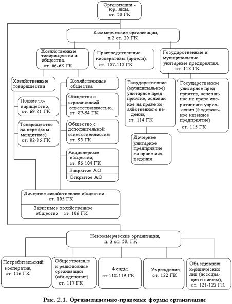 Организационно-правовые формы производственных организаций в соответствии с Гражданским кодексом РФ приведены на рис.2.1. Характеристика коммерческих организаций по основным признакам приведена в табл. 2.1.