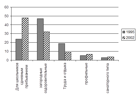 Из рисунка 5 видно, что наибольшее количество детей (48%) в 2002 г. отдыхало в городских школьных лагерях с дневным пребыванием. Что почти вдвое больше (26%), чем в 90-е годы. При этом число лагерей увеличилось лишь на 7% (в 1990 - 33,1 тыс., а в 2002 35,5 тыс.).