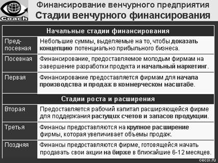 За рубежом, особенно в США и в ряде стран Западной Европы, механизм венчурного финансирования инновационных проектов активно используется уже не одно десятилетие. Именно венчурный капитал способствовал реализации во второй половине прошлого столетия ряда крупнейших инноваций в области информационных технологий, микроэлектроники, биотехнологий и в других высокотехнологичных отраслях экономики этих стран