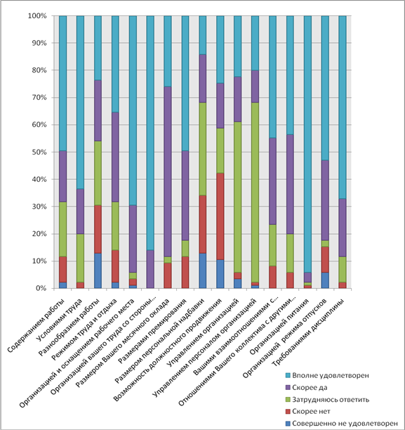 Из таблицы 2.4 и рисунка 2.2 можно сделать вывод о том, что практически все работники полностью удовлетворены содержанием работы, условиями труда, организацией и оснащением рабочего места, организацией труда со стороны руководителя, размерами премирования, взаимоотношениями с руководителями, организацией питания, организацией режима отпусков и требованиями дисциплины. Однако некоторое волнение вызывает недовольство сотрудников размерами персональной надбавки, возможностью должностного продвижения.