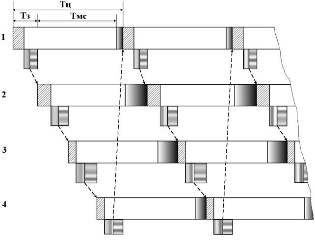 Рис. 8. График циклов многостаночного обслуживания с кратной продолжительностью свободного машинного времени (ТМС 2 = ТМС 3 = 3ТМС 1).