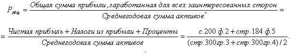 1. Общая рентабельность совокупных активов (отношение общей суммы прибыли от всех видов деятельности до выплаты процентов и налогов) - характеризует, сколько прибыли получено на рубль вложенного капитала для всех заинтересованных сторон: предприятия, кредиторов, государства и работников предприятия: