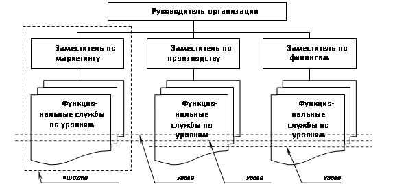 Основу линейно-функциональной структуры составляет «шахтный» принцип построения и специализация управленческого персонала по функциональным подсистемам организации (маркетинг, производство, исследования и разработки, финансы, персонал и т. д.). По каждой подсистеме формируется иерархия служб («шахта»), пронизывающая всю организацию сверху донизу (рис. 1.11).